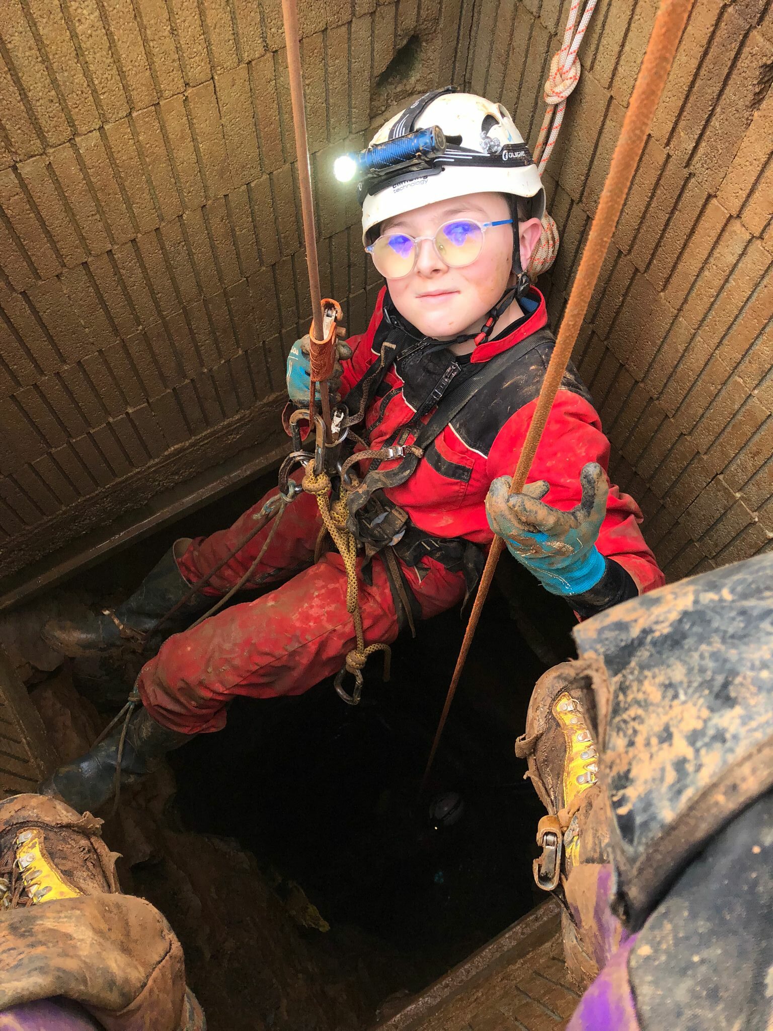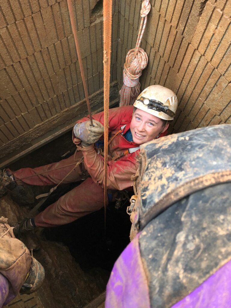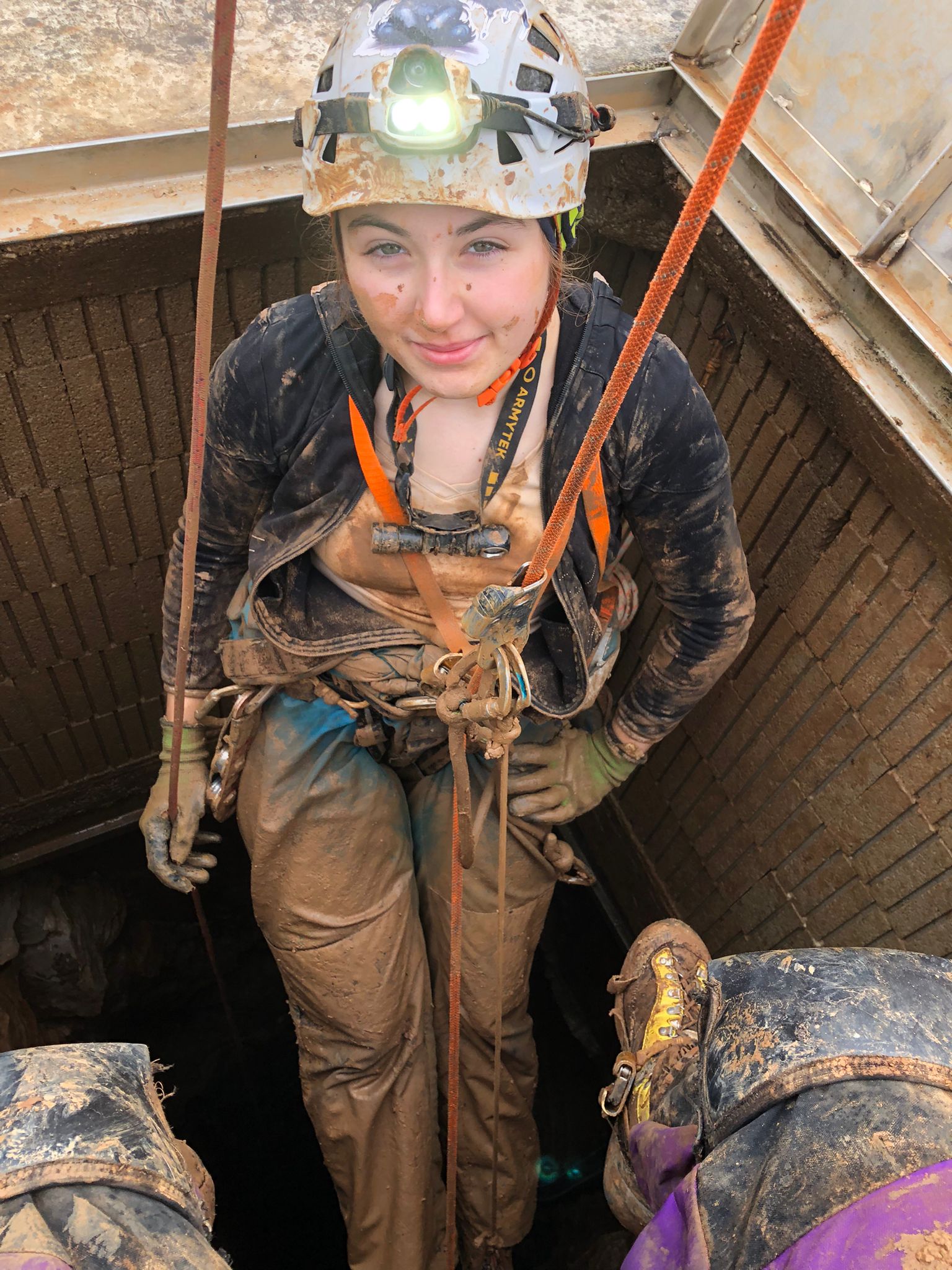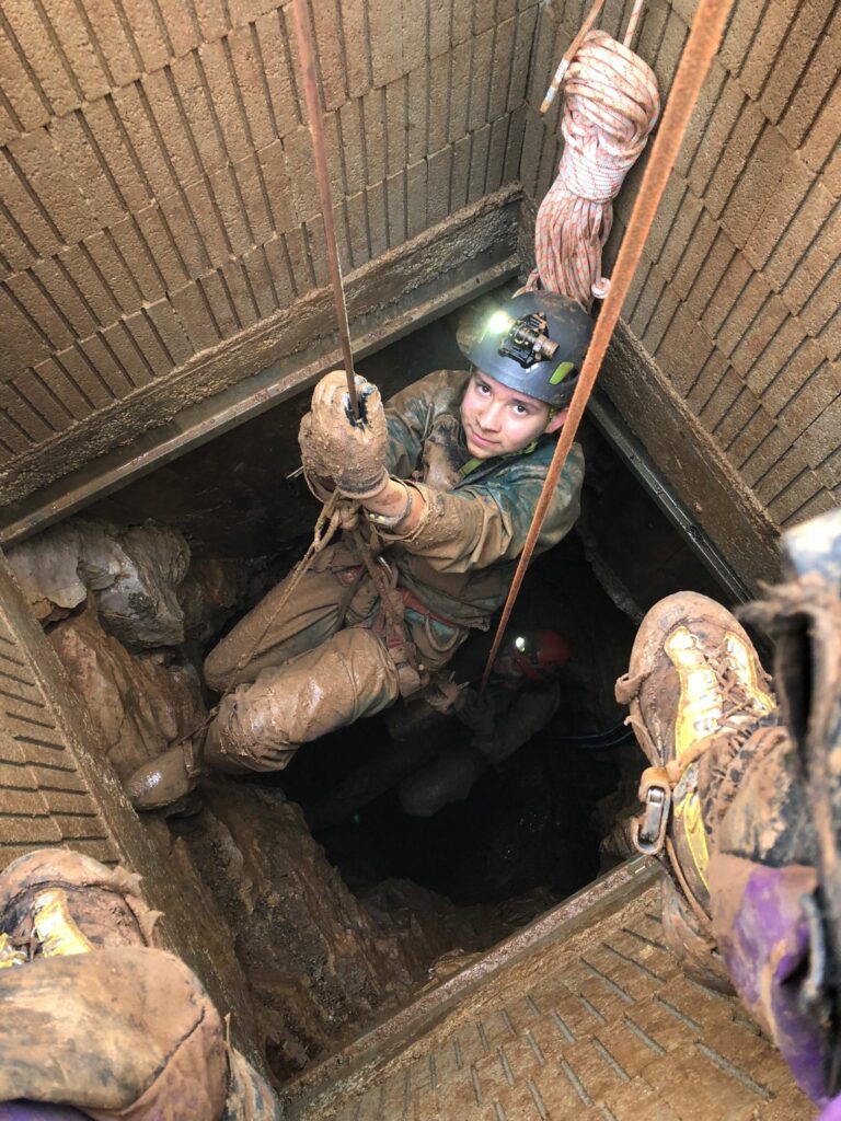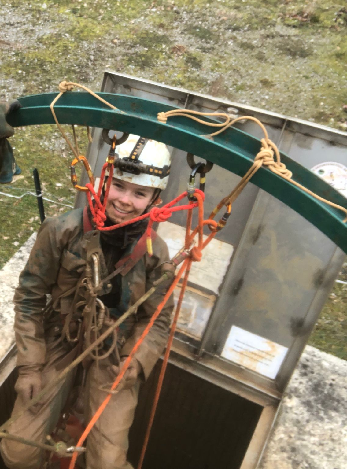 Pour atteindre cette rivière souterraine, la petite équipe a dû crapahuter un peu aussi mais surtout équiper quelques obstacles, notamment : P18 (puits de 18 mètres), R6 (ressaut de 6 mètres) et P28. Chloé et Maëva se sont chargées de cette tâche sous les yeux attentifs de Jérémy et Orianne. A peine étaient-ils arrivés dans la grande salle de la Clé de voute, qu’ils ont dû, pour respecter l’horaire, rebrousser chemin. Une escapade légèrement boueuse pour cette équipe…