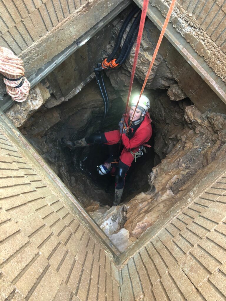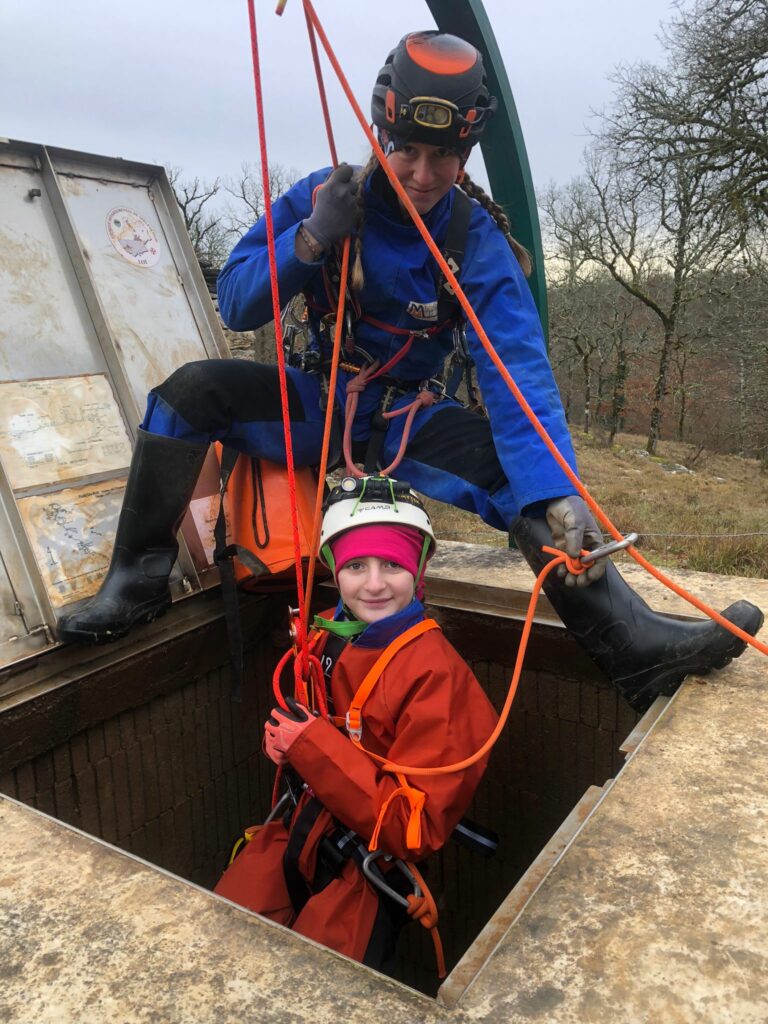 Après avoir écouté un bref historique de ce site par Sophie et Binj (forage d’accès dans le cadre du spéléo secours des Vitarelles en 1999…), toute l’équipe est descendue par le puits d’entrée d’une quarantaine de mètres.